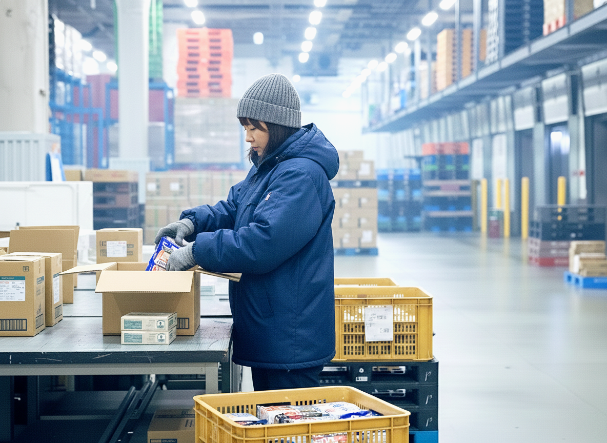 物流倉庫内で食料品の仕分けや包装などをするお仕事です。